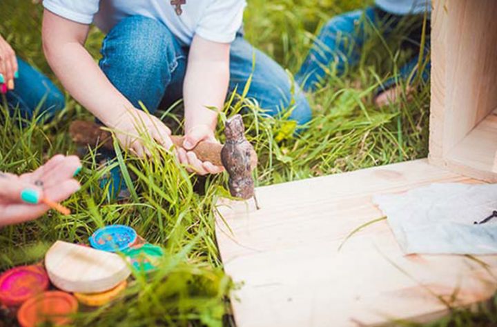Dê um martelo ao seu filho. Use uma madeira macia e escolha pregos com a cabeça larga. Primeiro, terá que começar a martelar para ele. Quando seu filho estiver pronto para fazer sozinho, você pode empurrar o prego através de um pedaço de papelão para fixá-lo no local, enquanto ele martela na madeira.